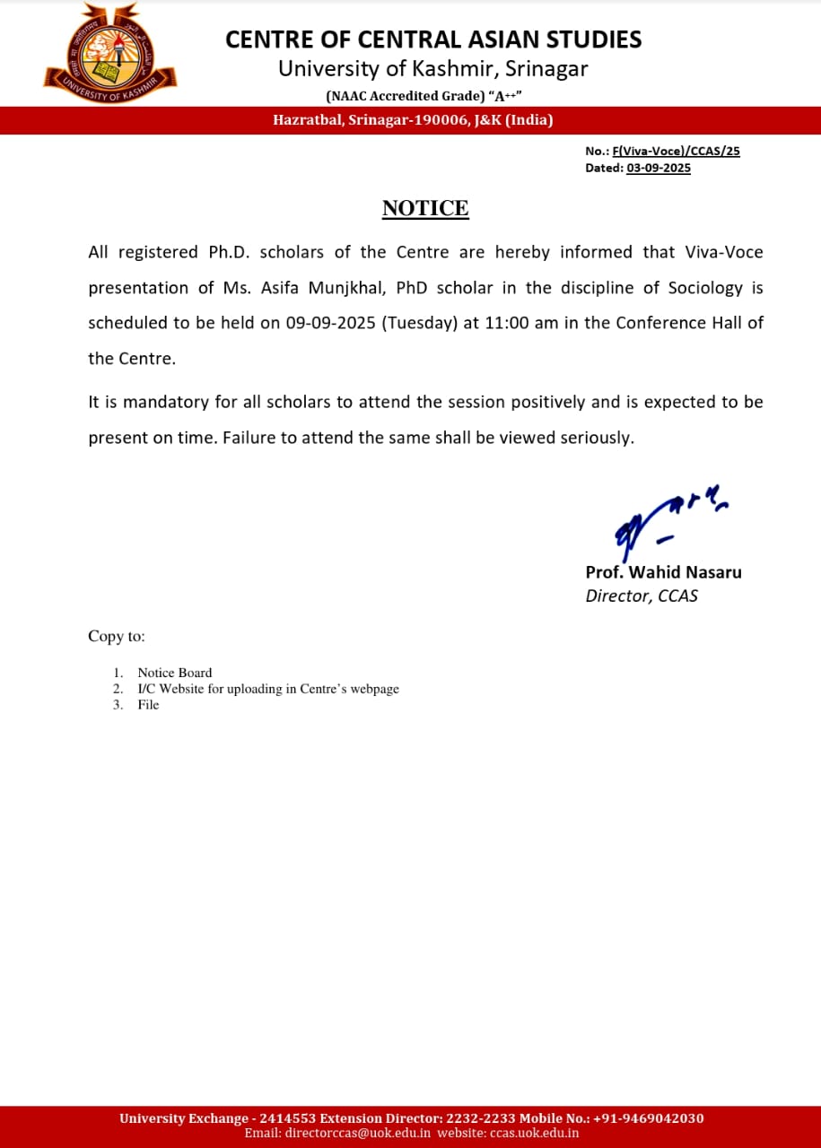 PhD Viva Voce of Ms. Asifa Munjkhal, research scholar in the discipline of Sociology is scheduled on 09-09-2025 View